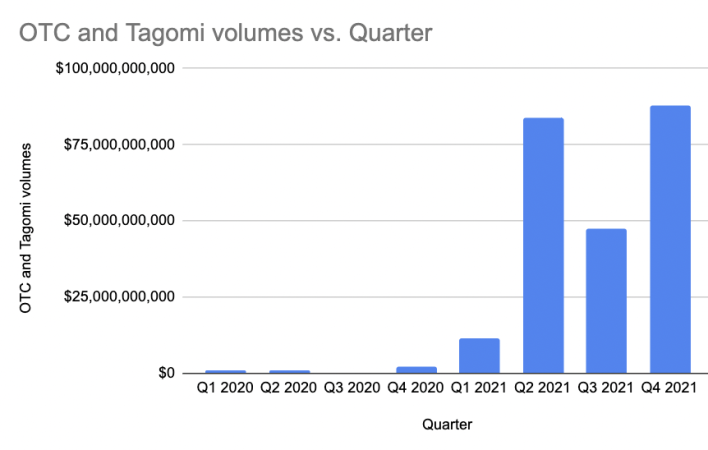 According to a spokesperson, the difference represents the volumes Coinbase brought in via institutional trading offerings: its over-the-counter trading desk and prime brokerage unit Tagomi. This quarter it amounted to $88 billion — an all-time high.